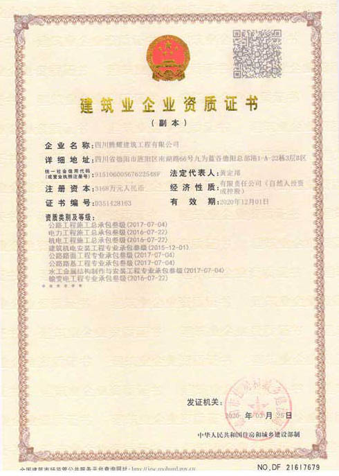 四川騰耀建筑工程有限公司  地址:四川省德陽市旌陽區南湖路66號九為藍谷德陽總部港1-A-22棟1層  電話:0838-2507855